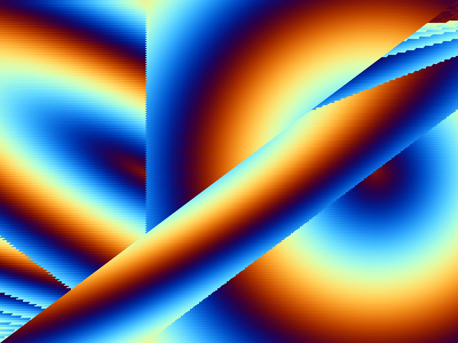Though I was not aware of it yet, the above image was indeed my triangle, and COLORPITCH0 was merely in “macrotiled” mode. Once I realized this, I produced this image (still in off-screen VRAM):